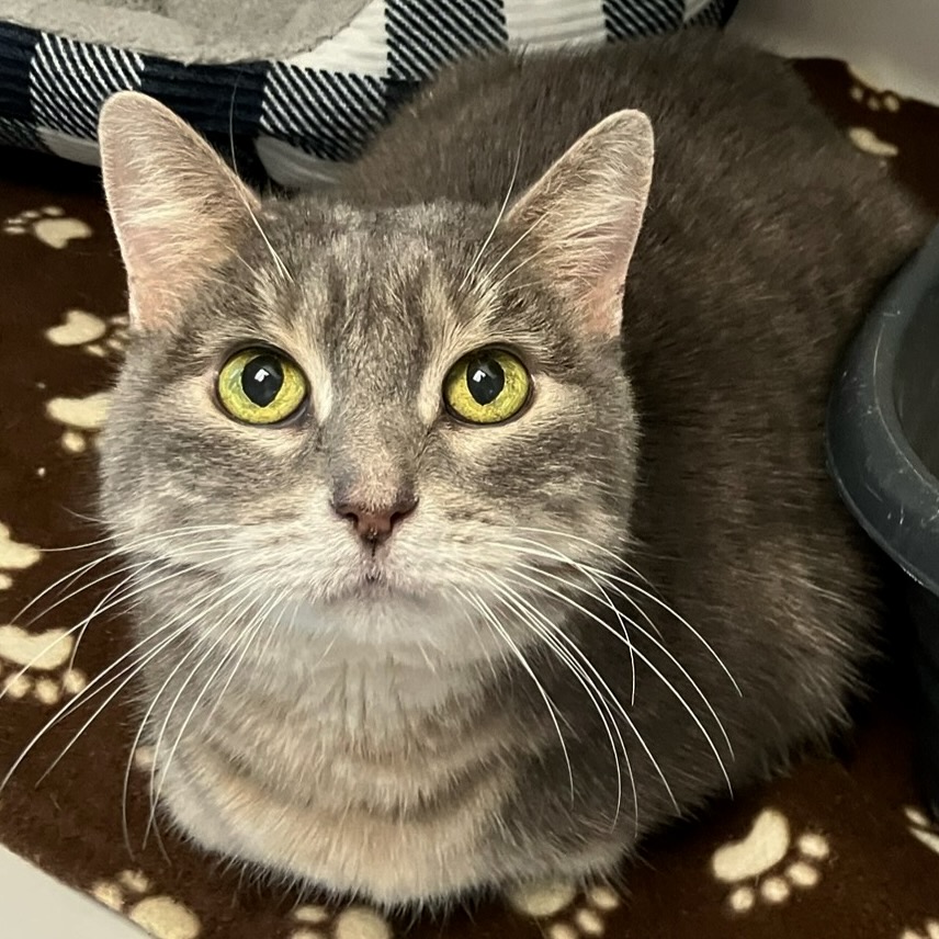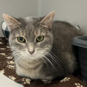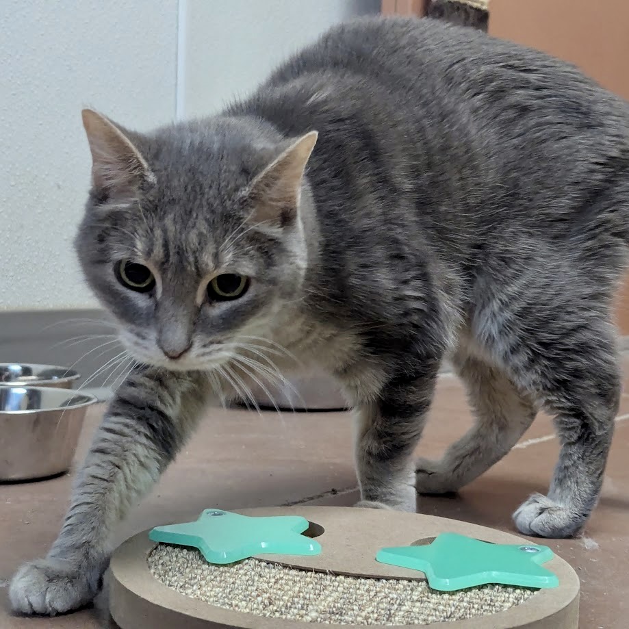 When my owner couldn’t care for us, my buddy Foxy and I came to The Animal League. I’m getting used to my new surroundings, but I’m a little wary of my feline roommates. However, the volunteers are paying me attention and I like petting and chin scratches. Brushing, not so much. My coat is a light grey stripe and my eyes have a greenish hue.  Despite my age I still like to play! And speaking of age, my senior status earns me Vet Care Support for Life—so don’t let that stop you. Come look for me on a low perch in my room.