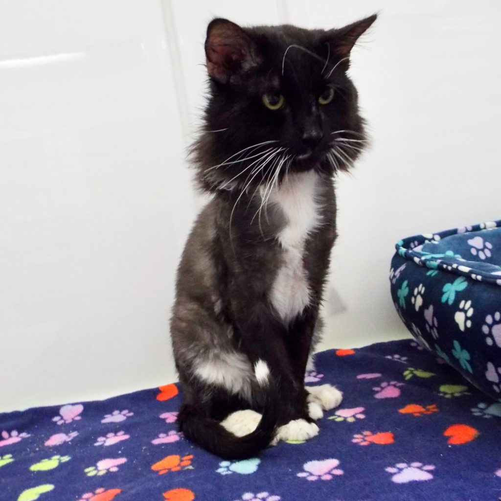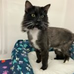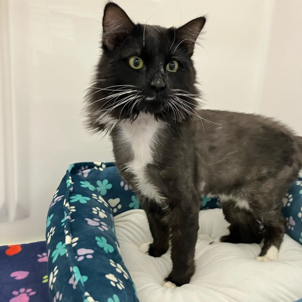 I’m not your ordinary tuxedo cat. I currently have a “lion’s cut” and I’m a handsome boy! Perfect markings: white chest, white paws, and white tip on my tail accent my black fur coat. But enough about my looks! You must meet me to appreciate my cuddly, loving nature. I curl up for petting. I LOVE to be caressed with scratches behind my ears. I also like to play with wand toys. I’m curious about a lot of things, including how I got here from another shelter. Surely, I had my own human in the past. I need a new human(s) to love. I crave companionship, so please come meet me and take me home with you!