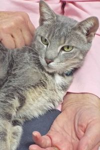It’s not always fun being one among many. It’s often great to have others to play with, but sometimes you miss out on individual attention, too – which, in my view, is very important! My disabled mom could no longer care for all the critters she’d accumulated, so she had a friend bring my kittens and me here where she knew they’d help us find new homes. My babies (Stormy, Cloudy, Frosty, and Snowy – we’ve been dubbed “weather litter”) and I are ready to embark on our new lives, spreading around all the feline joy we’re known for. I’d sure like to send some of that your way, so come meet me – it could be Kismet!