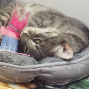 What’s not to love about me? I’m cute and playful with handsome grey stripes all the way to the end of my tail! I can do pretzel-turns in my bed, as well as relax for my nap. My favorite toys? Wands with dangling baubles and stuffed lizards. (I probably saw real lizards in the desert where I was found. I MUCH prefer these toy ones!) Originally, I was adopted from another shelter, but my microchip was never activated so my humans couldn’t be found. That’s why I’m at The Animal League. Volunteers carefully plucked cacti prickers from my fur. I feel so much better! So now, please come meet me and let’s go home together!