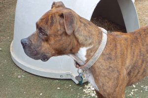 Do you sing off key? Well, that’s what my bark sounds like: off key. (Way. Off Key.) But hey, you’ll always know where I am, because there is no mistaking my voice for anyone else’s! I’d like to go and explore new places with you, play keep-away with my toys, and get petted. I like to run and I can also jump pretty high. After all, I am a handsome young Boxer/Staffie mix used to working out, and I like to maintain my attractive physique! I lived with a person who had to move and left me and another doggie in the yard, but a friendly neighbor brought us here to find brand-new families who will love us forever!