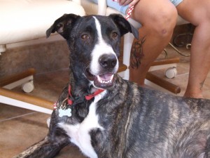 BOO BOO is a 1 ½-year-old handsome brindle and white male Great Dane/Greyhound mix.He is gentle and good with children ages 6 and 8. Boo Boo is fully housebroken and leash-trained. Boo Boo is being treated for Valley Fever and has a weak left front foot, but he gets around very well and loves to play with other big dogs.