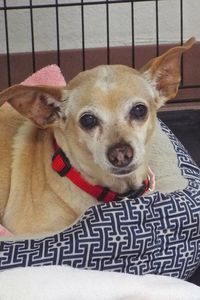 I am an old Chihuahua lady and yes, I know, my age shows. (It happens when you are almost 16 years old!) There are the usual aches and pains in the joints, and I’m getting a bit forgetful, too. I still enjoy short walks around the neighborhood though. My favorite place is on the lap of my person. I alert my people when I have to go potty, but sometimes they don’t understand as quickly as I need them to! Are you someone who would not expect too much from me, but can take me into your heart for the time I have left? TALGV provides my vet care support for life, so no need to worry about medications and such. Let’s meet and see how we like each other!