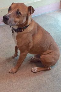 After just 3 months together, my person’s job took him out of state and I came here. That was a tough break because I’d been a good boy. I’d gotten along with the two cats at home, was gentle and tolerant with the kids there (ages 11 and 13), and stayed with a senior member of the family. With them, I was “very quiet” and “very attentive.” You know why? Because I’m happy in the company of people. Oh, I’m cautious with strangers, but once acquainted, we can be good buddies. I’m an 8-year-old who’s good on a leash and knows how to “ask” to go outside. With me, you’ll have a nice medium-size dog who’ll be loyal to you forever. Please let me show you what a good boy I can be!