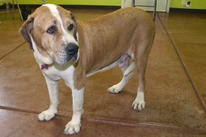 Okay, the secret’s out: I’m a big guy! There’s 100 pounds of me to love. And these days, love is exactly what I need. I’m an 8-1/2-year-old Saint Bernard mix male, tan and white, with dreamy brown eyes. When I was just a puppy, I was found out in the desert. For the last 5 years, I’ve lived outside most of the time, where I acted as a sentinel. Now, in my mellow out years, I’m hoping for a soft, comfy place to relax and enjoy the days. I know “sit,” am leash trained, got along with the cat I grew up with, and I come with Free Vet Care for Life. I hope you and I can meet, cause if you have a big heart, I’d be so happy being your big buddy.
