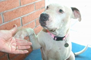 When the volunteers say, “She wags her tail so hard she almost falls over,” you know that I love people! When I was found at Walmart, I had a lot of scabs and scars on my head and it was apparent that I’d had puppies recently, but that certainly hasn’t dampened my enthusiasm for life! My rescuer only had me for three days, but said that I was very sweet, was excellent on a leash, was very gentle with getting treats and food, and went into my crate easily. I didn’t, however, get along with his resident dogs and cats (but that may have been a “there’s a stranger in town” thing on their parts!). I’m a sweet 57-pound, Staffie girl who just wants some humans to love.