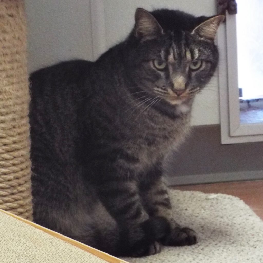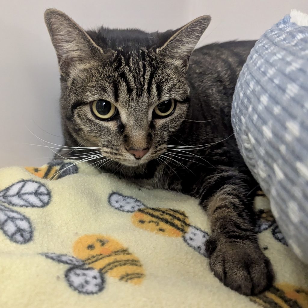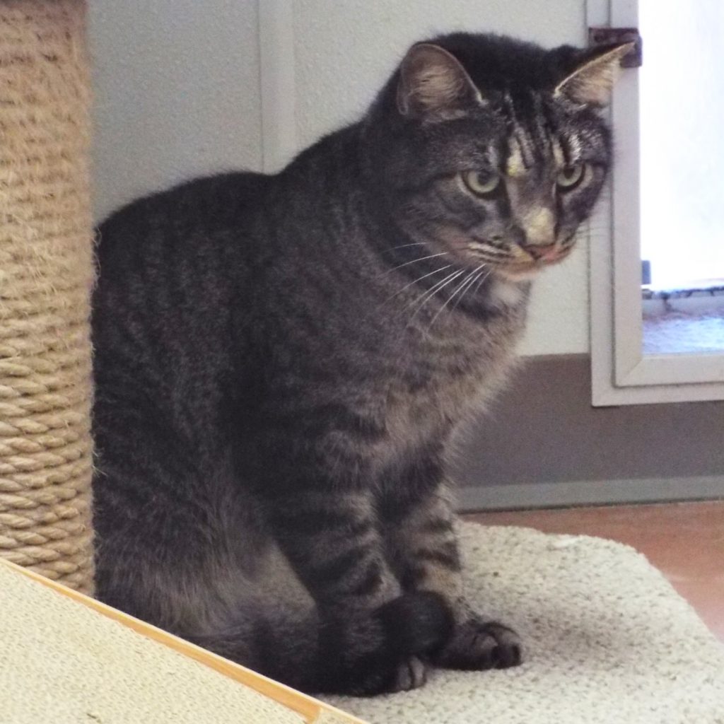 My roomie Cha Cha and I were left in a home where someone is allergic to us—boo hoo! That’s our bad luck. I love scratching and laps, and will rub your legs for attention. You can’t accuse me of being shy! I wasn’t always nice to Cha Cha though, so maybe a home without another cat would be best. I am a beautiful tabby girl with black stripes and yellow eyes. I’m middle aged and would love to spend the rest of my life with a human companion. Why not come meet me? I think you’ll be impressed with my outgoing personality. (3-2024)