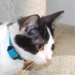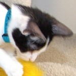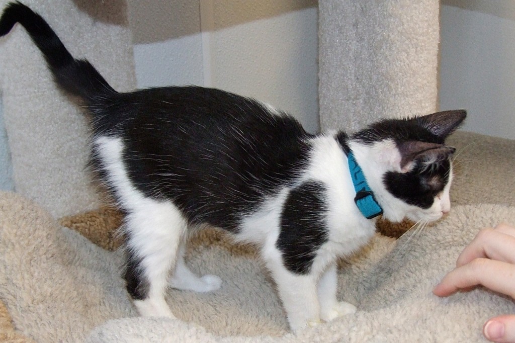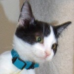 When I first arrived as a teensy baby I was part of “the cereal litter” and went to live with a foster mom for a while until I was old enough to “mingle” here. All my siblings have found homes except my brother, Wheatie, and me so I’m getting a little antsy! Despite how much fun it is to have tons of playmates, like every feline, I really want a home and family of my own where I can participate in all the kitten activities that aren’t available to me here (like helping with chores, reading the paper, doing Internet searches — stuff like that!). I’m a darling, black and white boy who’s past that “go-go goofy” stage but still eager to spend lots of time entertaining you!