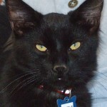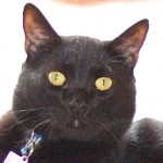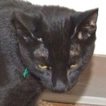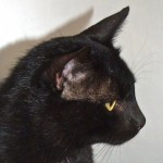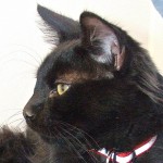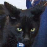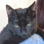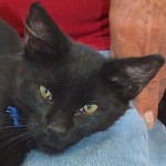 When my biographer asked one of the volunteers about my personality (since I was found on the streets of Nogales, my “history is a mystery” as they say!), she said, “Oh, Elliot’s a hoot”! Well I’ll try to live up to that by being the most endearing, entertaining, into-everything, lap sitting, purr-in-your-ear companion you’ve ever dreamed of! They think I’m in the neighborhood of 12-18 months old so all the good things you love about kittens are still “going on” — just without the crazy stuff the really young ones are into. I’m a handsome, lanky, solid black guy (except for one white spot on my chest) and I’m longing to spend the rest of my life in the safety of a home where I can do “my thing” with you.