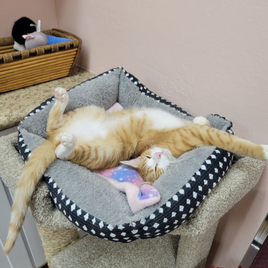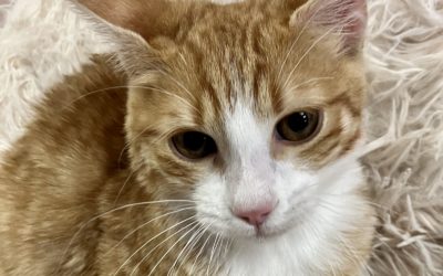 I’m full of personality! I demand attention, from the time I wouldn’t leave my rescuer’s garage until I meowed for a volunteer to come pet me. I cuddled up to my rescuer’s large dog. I’m a stray, so maybe I’m making up for all of that alone time. I will roll over and purr when you pet me, and I do like to play. I also really like to eat, so you have to watch me! I’m already a big boy but I don’t mind being picked up. I’m aching to find a home where I can be adored. Will you help me?