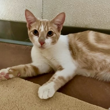 I was a little kitten when I came to The Animal League. All my siblings were adopted. I’ve grown to 13 pounds even though I’m only 10 months old now. I will play with you, but please don’t reach out to touch me. I’m extremely shy and retiring, and I’m still learning to trust people. Could you provide a home where my better qualities can blossom? I have a good relationship with the other cats and kittens here. I was once described as aggressive – could I be an alpha male? They call me Cantaloupe. Can we elope – or just walk down the hall to your home?
