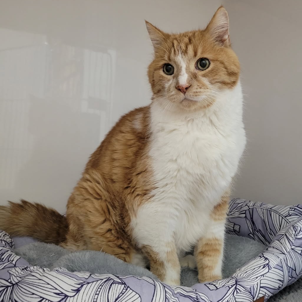 I’m back at The Animal League, again! I was adopted by a nice senior lady who developed health issues. Sorry she’s ill. I won’t lie – I’m a very needy guy. You’ve heard of “less is more?” Well, I’m the opposite – the more the better! I just adore being carried around in the cat sling. The socializers are brushing me daily to keep me well groomed. I guess I’m a bit lax in that department. Do you have time to spare and time to brush? Well, I’m the cat for you, especially if you want one that needs you desperately and will talk to you all day long.